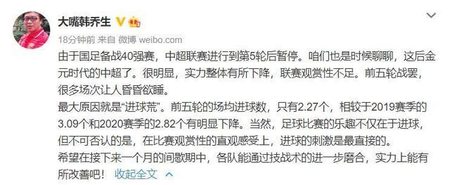 来源:24直播网05-19 15:1924直播网讯 北京时间5月19日,评述员韩乔生在个人社交媒体上发表了他对本赛季中超联赛的看法。