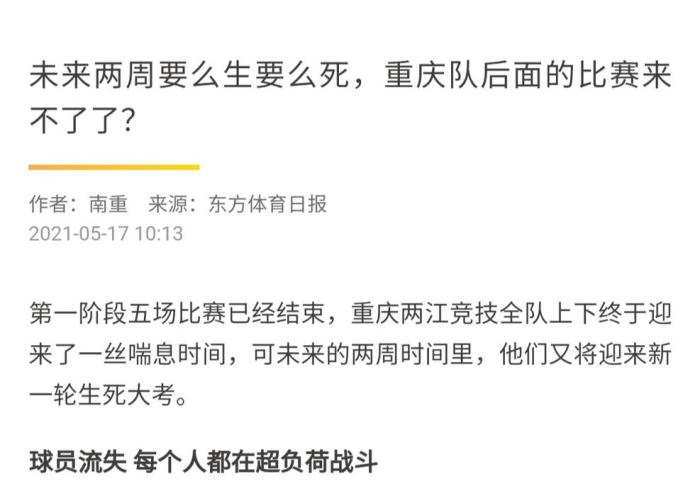 24直播网讯 据《东方体育日报》消息,休赛期重庆两江竞技的命运会见分晓,未来两周的内要么生要么死,俱乐部的存亡问题已经没有灰色地带了,一线队已经做好了最坏的打算。