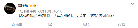 贺晓龙在微博中写道:“卡洛斯即将接手深圳队,去年在成都未竟之宏图,能否在深圳启航? ”