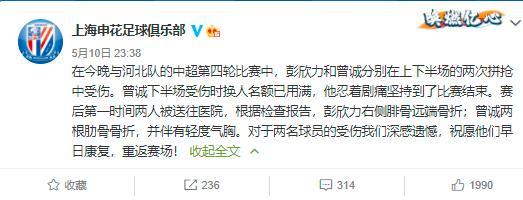 上海申花官方:“在今晚与河北队的中超第四轮比赛中,彭欣力和曾诚分别在上下半场的两次拼抢中受伤。曾诚下半场受伤时换人名额已用满,他忍着剧痛坚持到了比赛结束。赛后第一时间两人被送往医院,根据检查报告,彭欣力右侧腓骨远端骨折;曾诚两根肋骨骨折,并伴有轻度气胸。对于两名球员的受伤我们深感遗憾,祝愿他们早日康复,重返赛场!”
