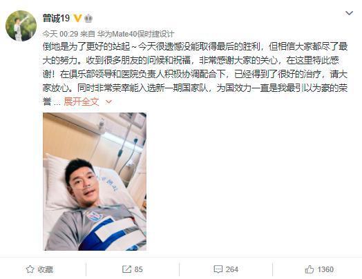 曾诚表示:“倒地是为了更好的站起~今天很遗憾没能取得最后的胜利,但相信大家都尽了最大的努力。收到很多朋友的问候和祝福,非常感谢大家的关心,在这里特此感谢!在俱乐部领导和医院负责人积极协调配合下,已经得到了很好的治疗,请大家放心。同时非常荣幸能入选新一期国家队,为国效力一直是我最引以为豪的荣誉,感谢各级领导和以李铁主教练为首教练组的信任,我衷心期待以及坚信大伙儿一定凯旋归来,中国队加油!必胜!”