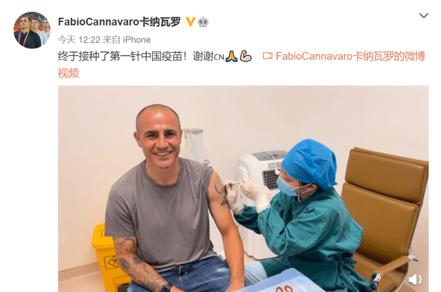 原来,卡纳瓦罗是接种第一针中国疫苗,通过视频可以看到小护士技术娴熟地给他完成接种。广州队主教练表示:“终于接种了第一针中国疫苗,谢谢!”其实,卡纳瓦罗对于中国的抗疫能力十分认同,他在去年就曾经给卡西利亚斯、罗纳尔多等球星谈论中国的抗疫能力,也把自己的亲生经历在意大利传播。而在今年返回中国经过14天酒店生活之后,他还给帮助他的工作人员送上自己的亲笔签名。
