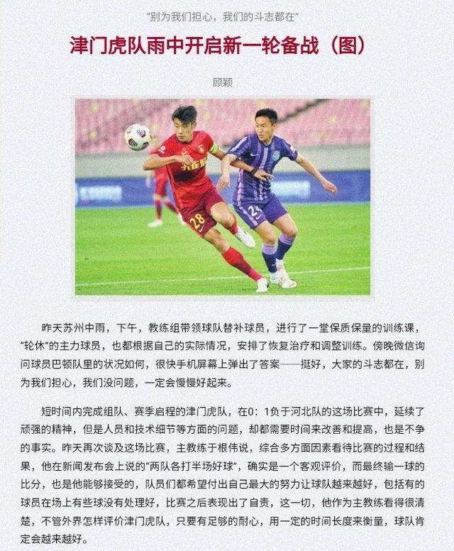 来源:24直播网05-07 11:3424直播网讯 北京时间5月7日,在中超第三轮联赛,天津津门虎0-1负于了河北队。《天津日报》撰文表示,虽然输掉比赛,但津门虎全体队员展现出了顽强的精神,至于人员和技术细节方面,的确需要时间慢慢提高。