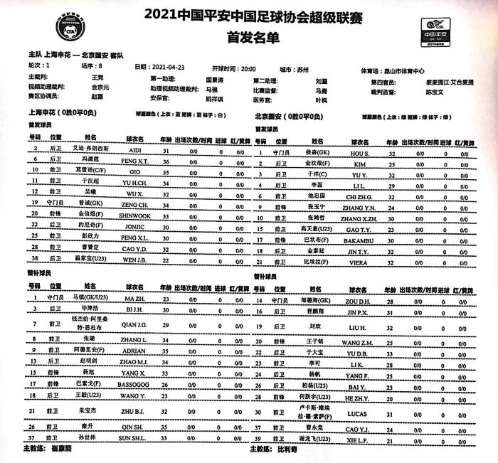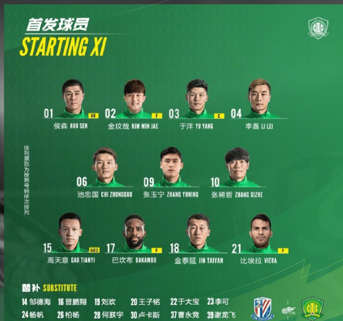 来源:24直播网04-23 19:0324直播网讯 北京时间4月23日,中超联赛第一轮,北京国安对阵上海申花,赛前,这场比赛的首发名单出炉。
