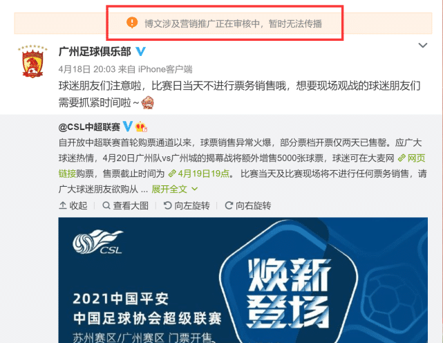 “中超揭幕战”将会在广州恒大和广州富力两支本地球队之间展开。而“天河体育中心”也承办了这一场比赛,以至于赛前就有大量的球迷疯抢球票。值得一提的就是,广州恒大官微宣布,从中超新赛季售票开启,大量的球迷成功获得了入场观赛的机会,但是仍有部分球迷却“扑了个空”。所以,在4月20日“广州德比”中增加五千张门票。同时,也表示有兴趣观赛的球迷请早点购票,因为比赛当他不会进行售票,导致“扑了个空”。万万没想到的就是,有媒体平台却给这样关心球迷的行为“限流”,仍在“审核中,暂时无法传播”。
