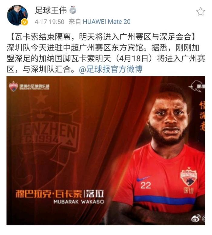 据记者王伟消息,瓦卡索结束隔离,明天将进入广州赛区与深足会合。